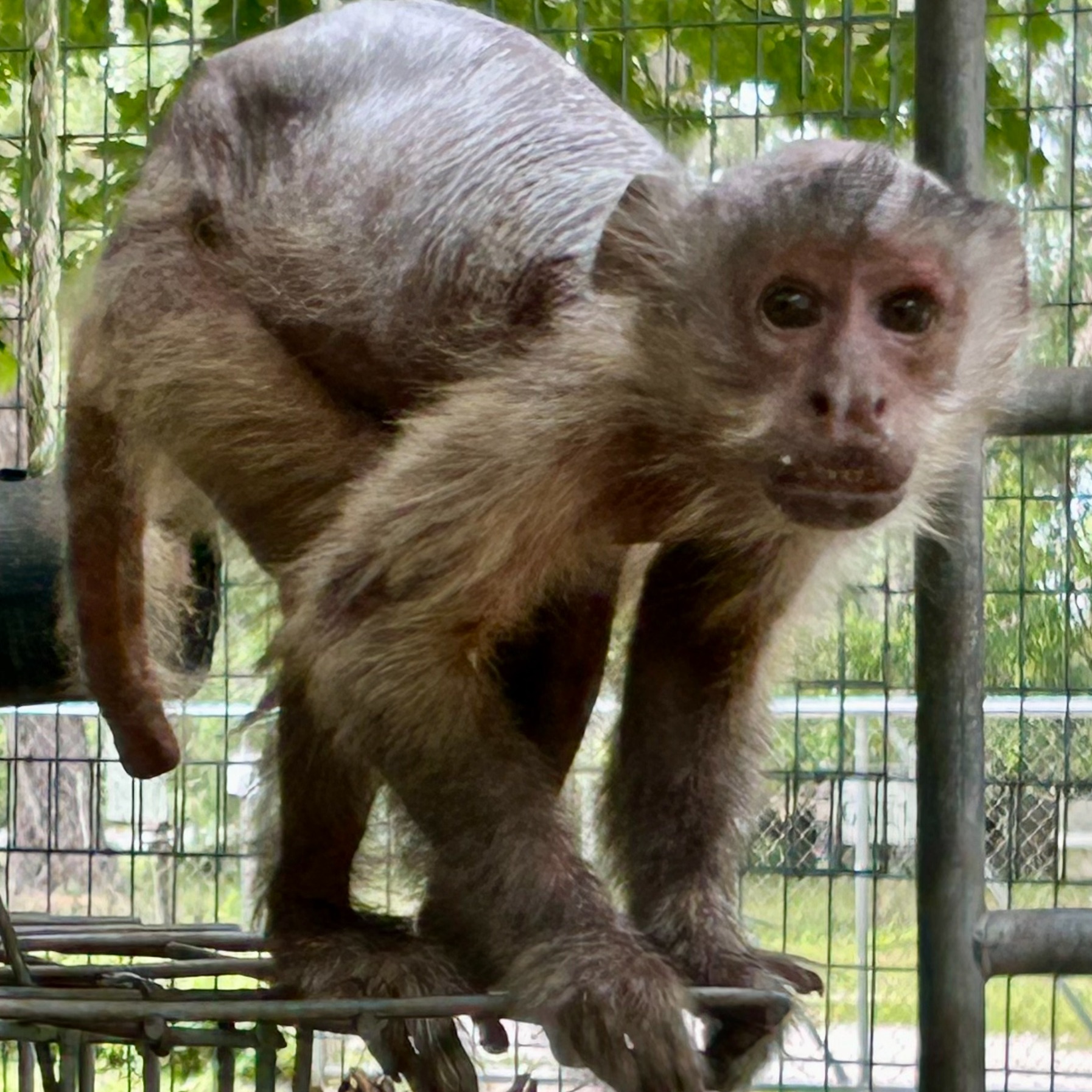 Aunt Jake, who arrived at Jungle Friends at the age of 30, spent her entire life as a subject of cognitive and behavioral research after being born at Wooster College in Ohio. Alongside her companions, Aunt Gizmo and Alex, she retired to sunny Florida after the study concluded. Aunt Jake stands out as the only member of the group without diabetes. Initially shy and slow-moving, she quickly blossomed into a charming flirt, delighting all the male monkeys in her vicinity with her lip-smacking ways. Her neighbors couldn't be happier to receive her playful attention.