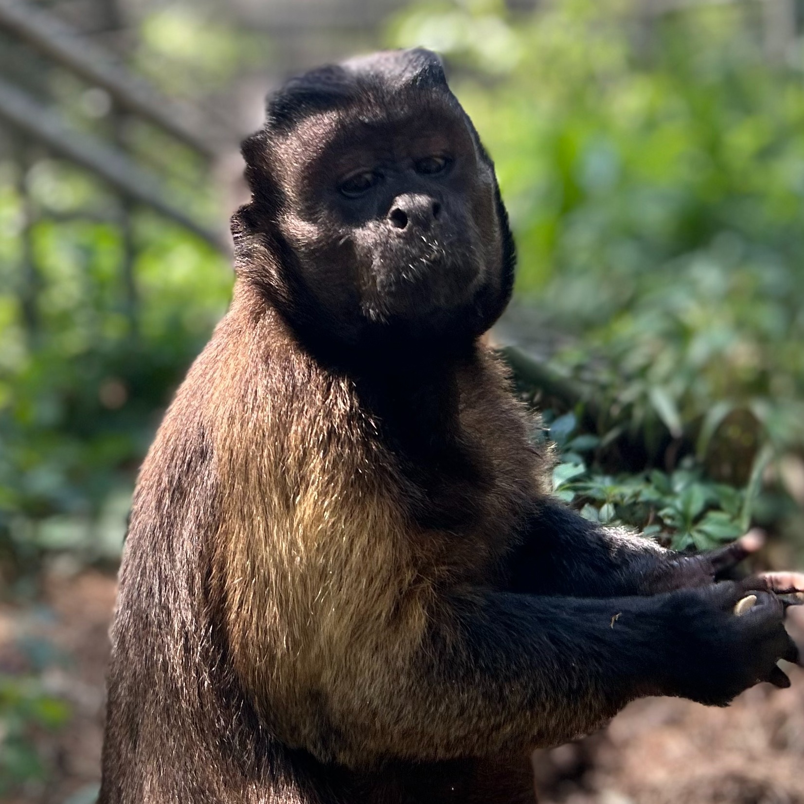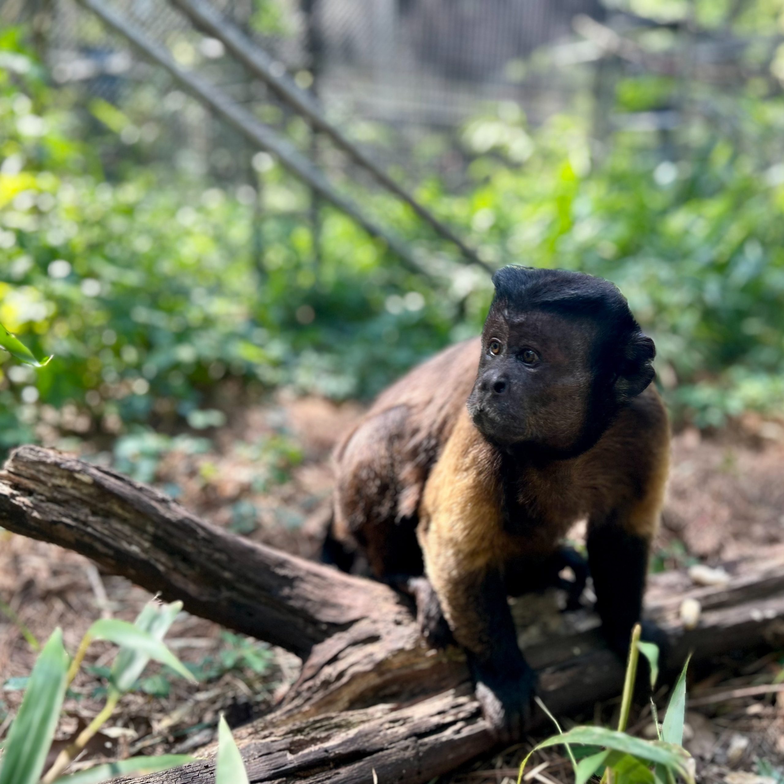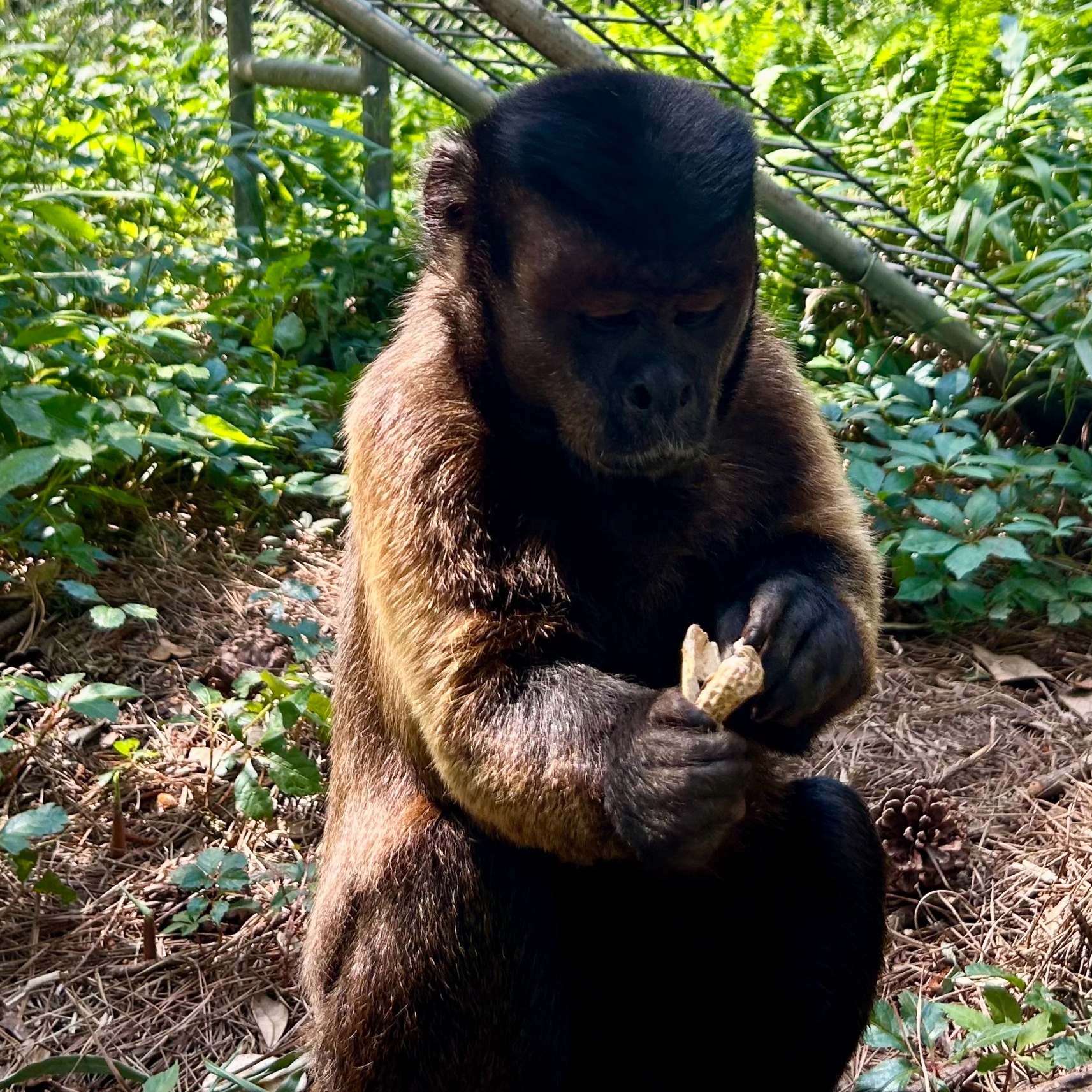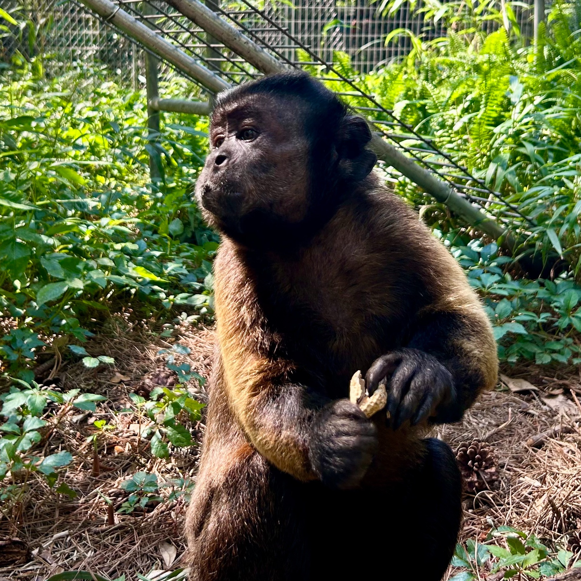 As a result, Dumbo and the other males were moved into a bachelor group until they could be properly vasectomized. After their procedures, they all recovered well, and Dumbo is now enjoying his new, beautiful habitat. It features buckets, barrels, rope ladders, plenty of grass, trees, bamboo, and other shrubs. Dumbo is very laid back, often amusing himself with bugs or leaves, napping in the sun, or grooming his companion.