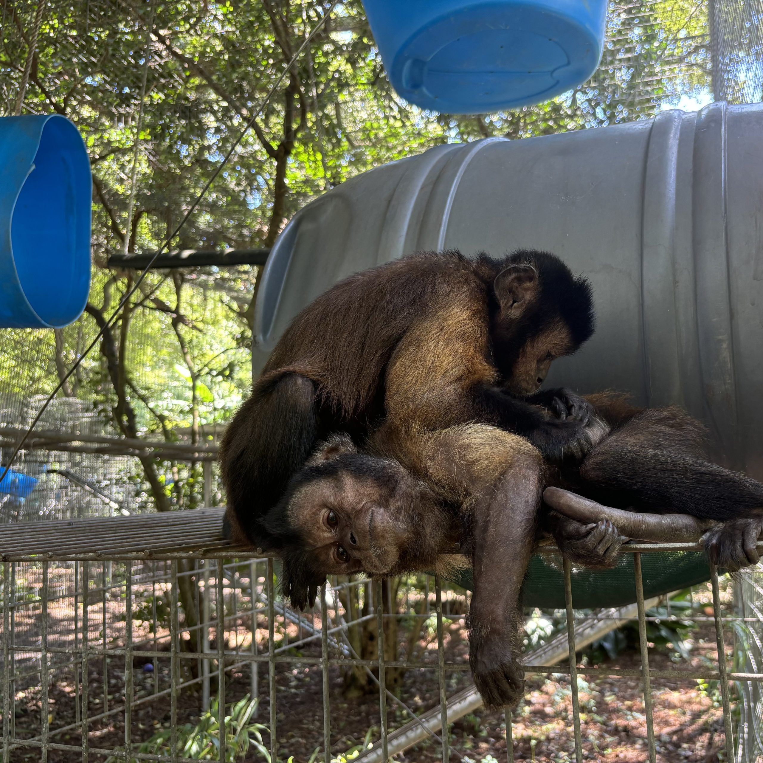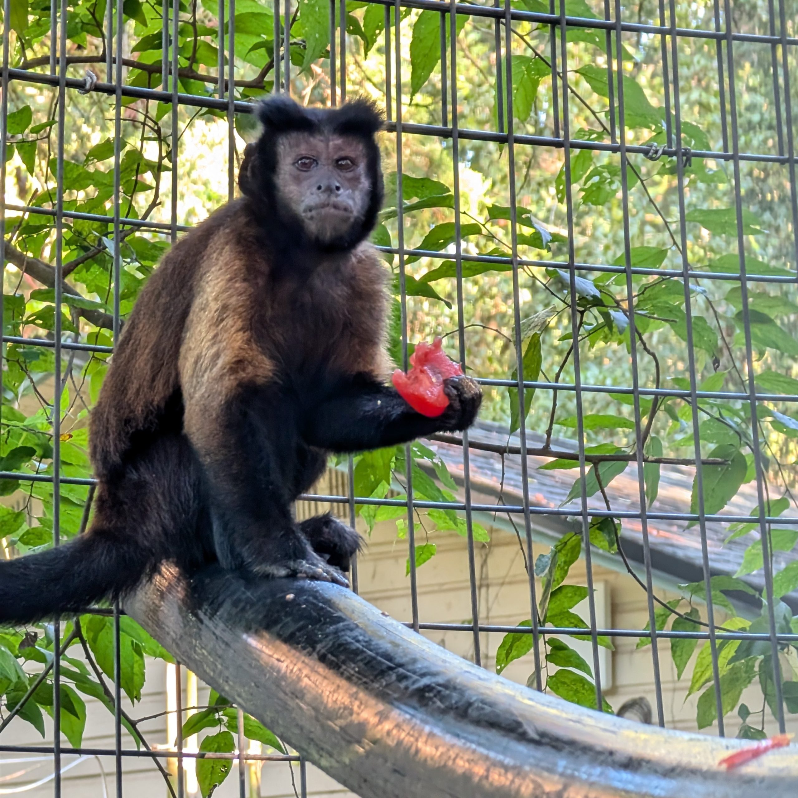 Ethel's journey to Jungle Friends began with a twist. She was part of a group of capuchins rescued from a bankrupt roadside zoo, a mission that seemed straightforward at first. Among the group, there was a known nursing mother and infant, so it was believed to be a routine rescue of a family unit. However, things quickly became more complicated when three monkeys unexpectedly gave birth, despite assurances that all the males had been vasectomized! This surprise led to some quick adjustments, with the boys forming a bachelor group until their vasectomies were confirmed, and the new mothers and their babies kept separate for a time. Afterward, Ethel and the other females without babies were reintroduced to the single males.
