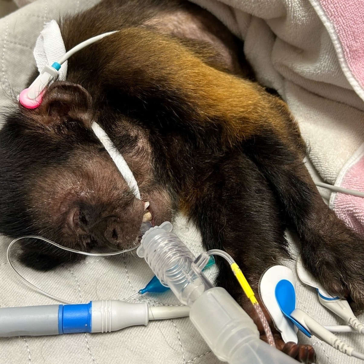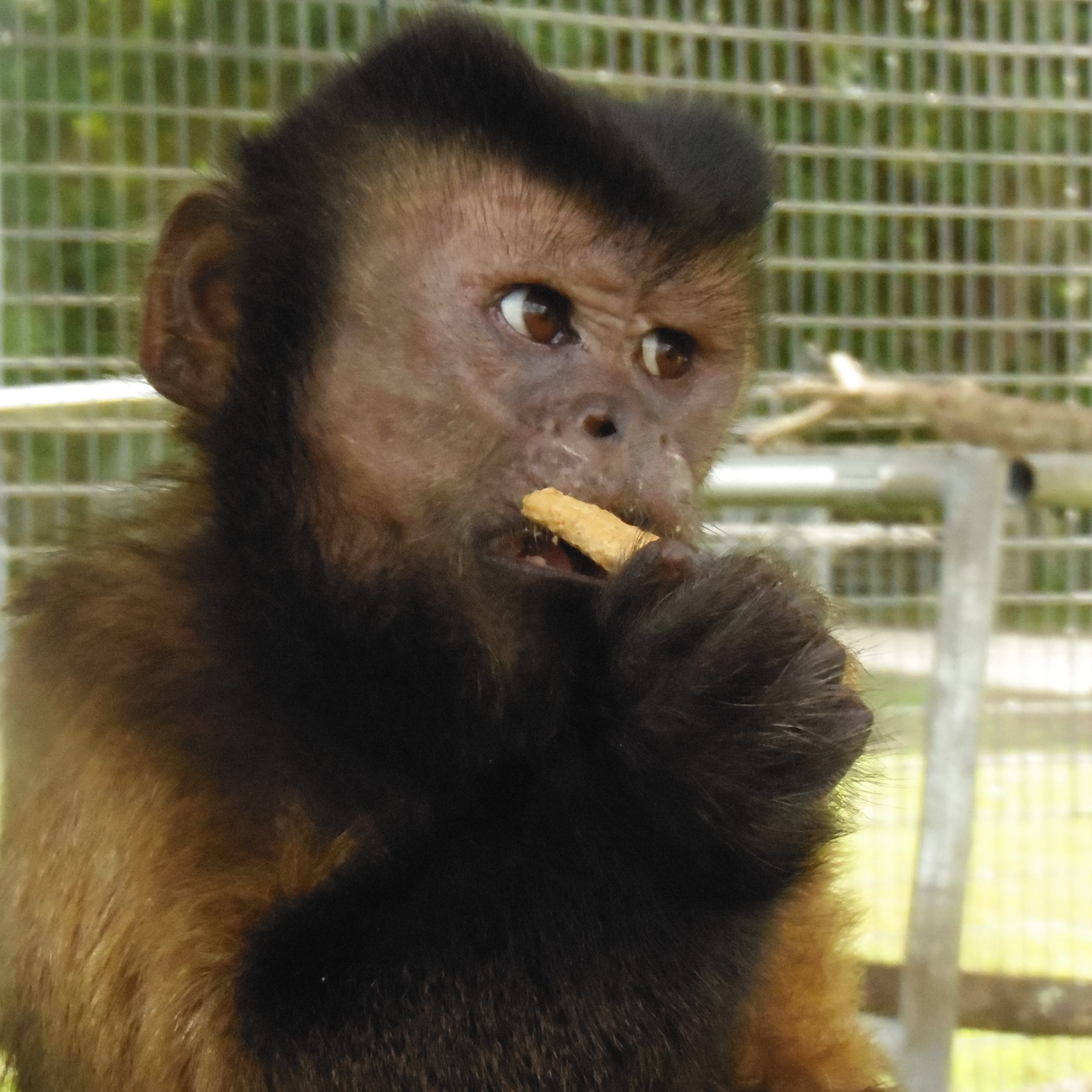 Micky and six other capuchins were retired to sunny Florida from the University of Georgia (UGA) lab where they were involved in cognitive studies. When Micky arrived at Jungle Friends he was the palest of the UGA Boys, but now he sports a great tan. Micky gets very excited when his caregivers bring out new and exciting foods. He knows the sound of the food carts and enthusiastically screams his "good food" call alerting his neighbors that food is on the way. Micky's love of food is reflected in his growing belly. Micky was a bit of a loner, until he met Rachel–now, you rarely see them apart. Our first priority at Jungle Friends is to find lone monkeys friends and allow them to do monkey things with their monkey friends in their spacious, lush, "Almost Wild" habitats. Micky was all alone in the lab, but now enjoys the company of one of our "Wild Girls" named Rachel.