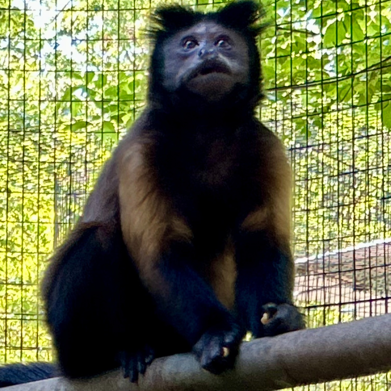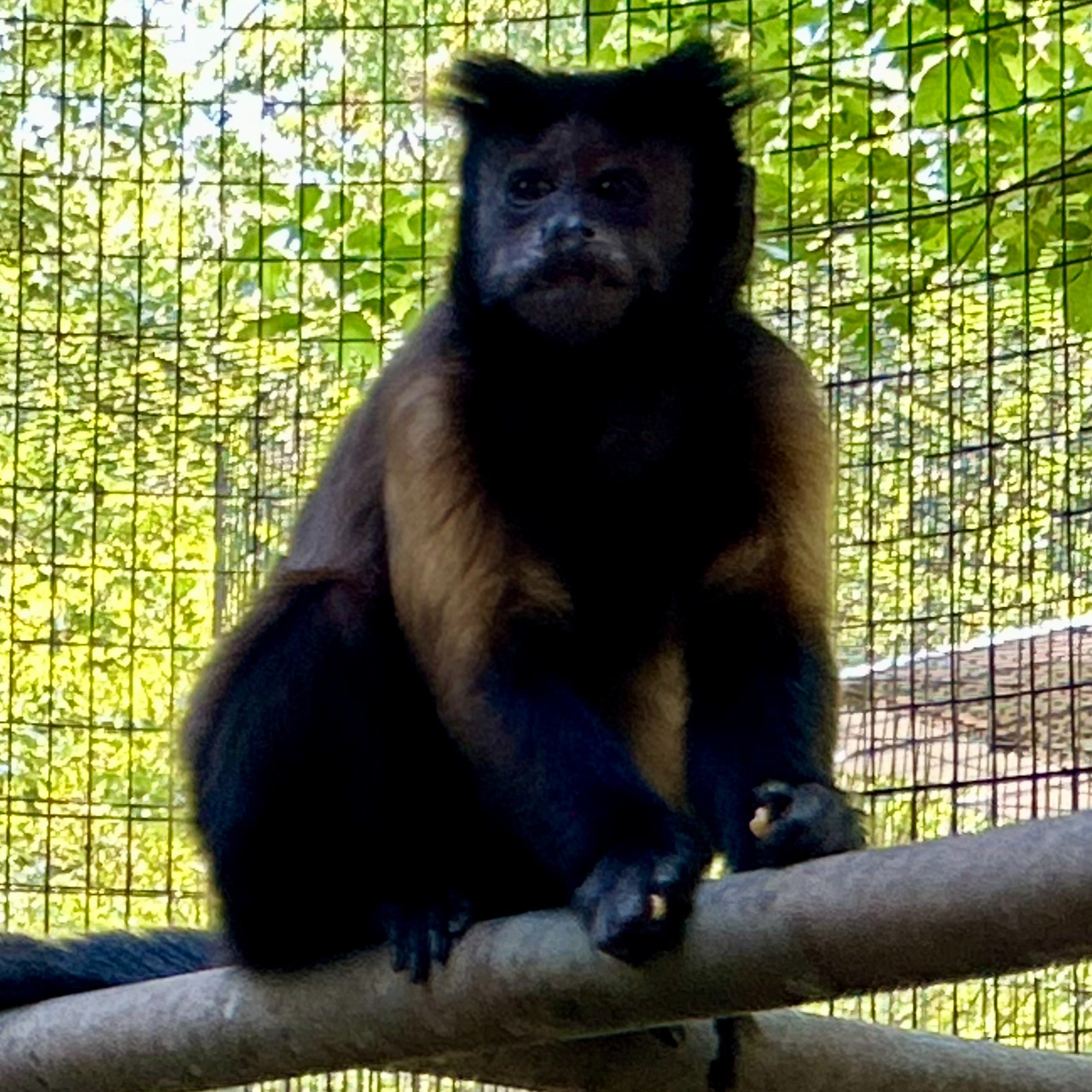 Monica was among a group of capuchins rescued from a bankrupt roadside zoo, where she had been living in an enclosure with 24 other capuchins. Initially, the rescue seemed straightforward: a family group with a nursing mother and infant needed a new home. However, things took an unexpected turn when three of the monkeys gave birth. Despite being informed that all the males had been vasectomized, this surprise led to the males being temporarily separated into a bachelor group for their procedures. Monica, Rachel, and her baby Skittles were moved into their own habitat to ensure Skittles received proper care. Thanks to her mother's attentive upbringing, Skittles doesn't exhibit any stereotypical behaviors like rocking, digit sucking, or self-grasping.