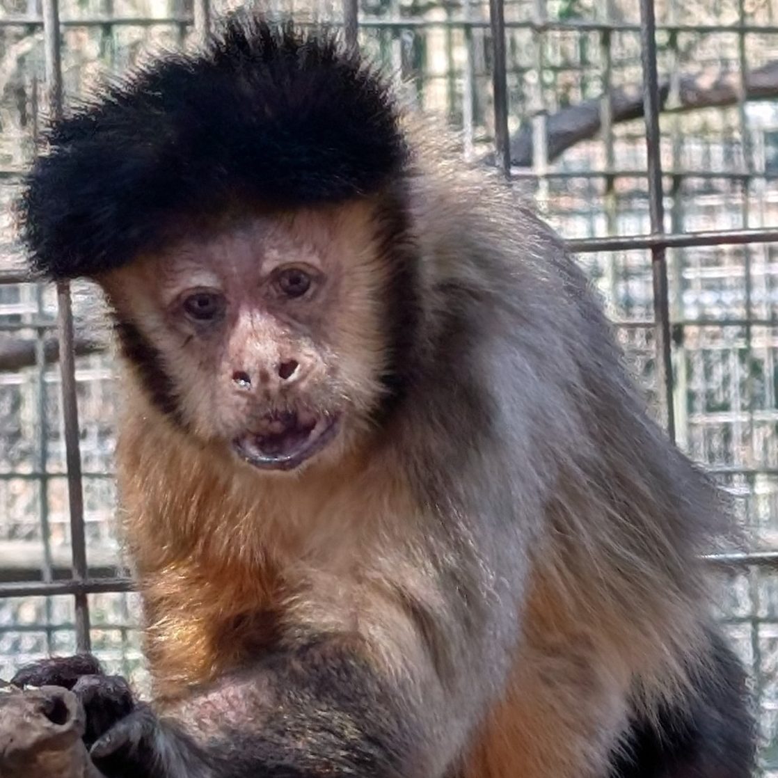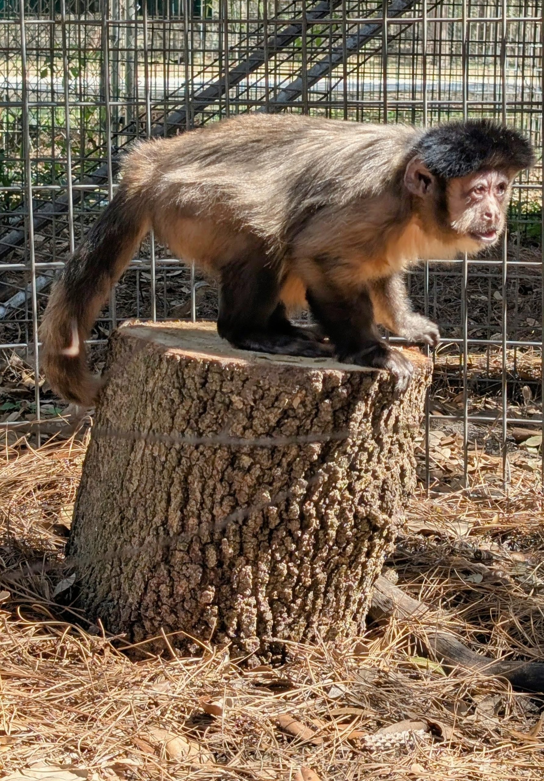 Since arriving, Susie has embraced sanctuary life with enthusiasm. She enjoys exploring her outdoor habitat, foraging through pine straw, and watching her neighbors. She now lives beside KC, another female in her 40s, and we hope that in time the two will become companions so Susie can spend her golden years with a monkey friend.