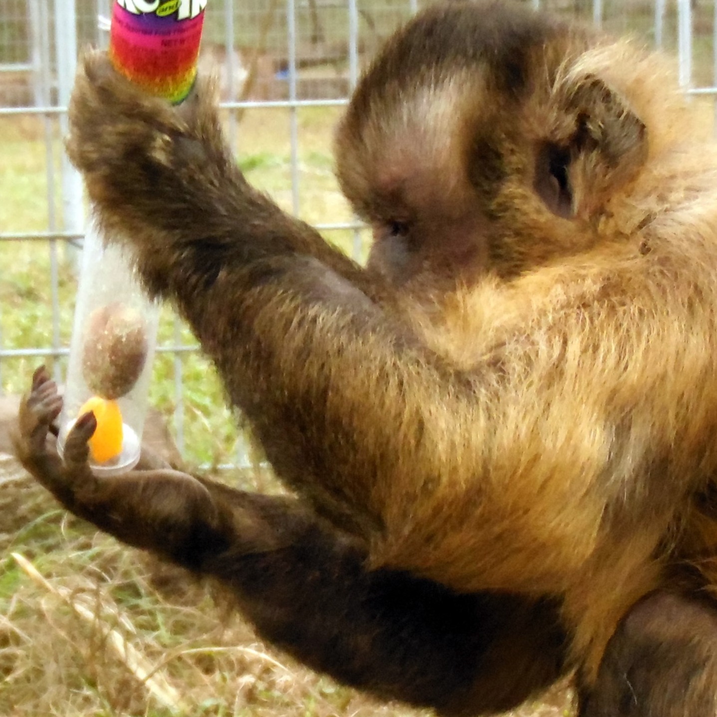 Xenon quickly became known as one of the sanctuary’s most intelligent residents. His remarkable problem-solving skills set him apart—whether it’s mastering complex enrichment puzzles or devising clever ways to access hidden treats, Xenon is always several steps ahead. He navigates his world with a quiet confidence, earning the admiration of both his fellow capuchins and the sanctuary staff.