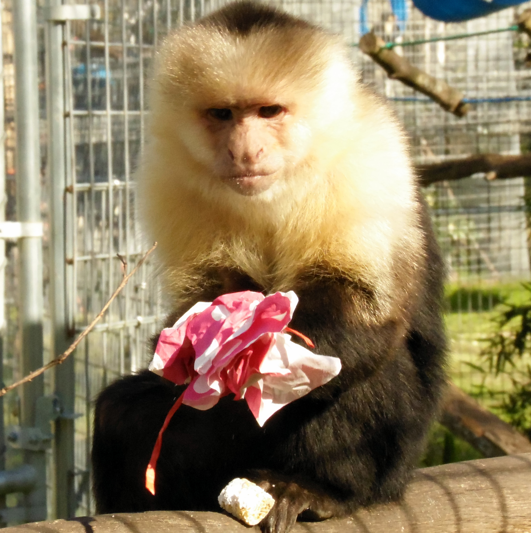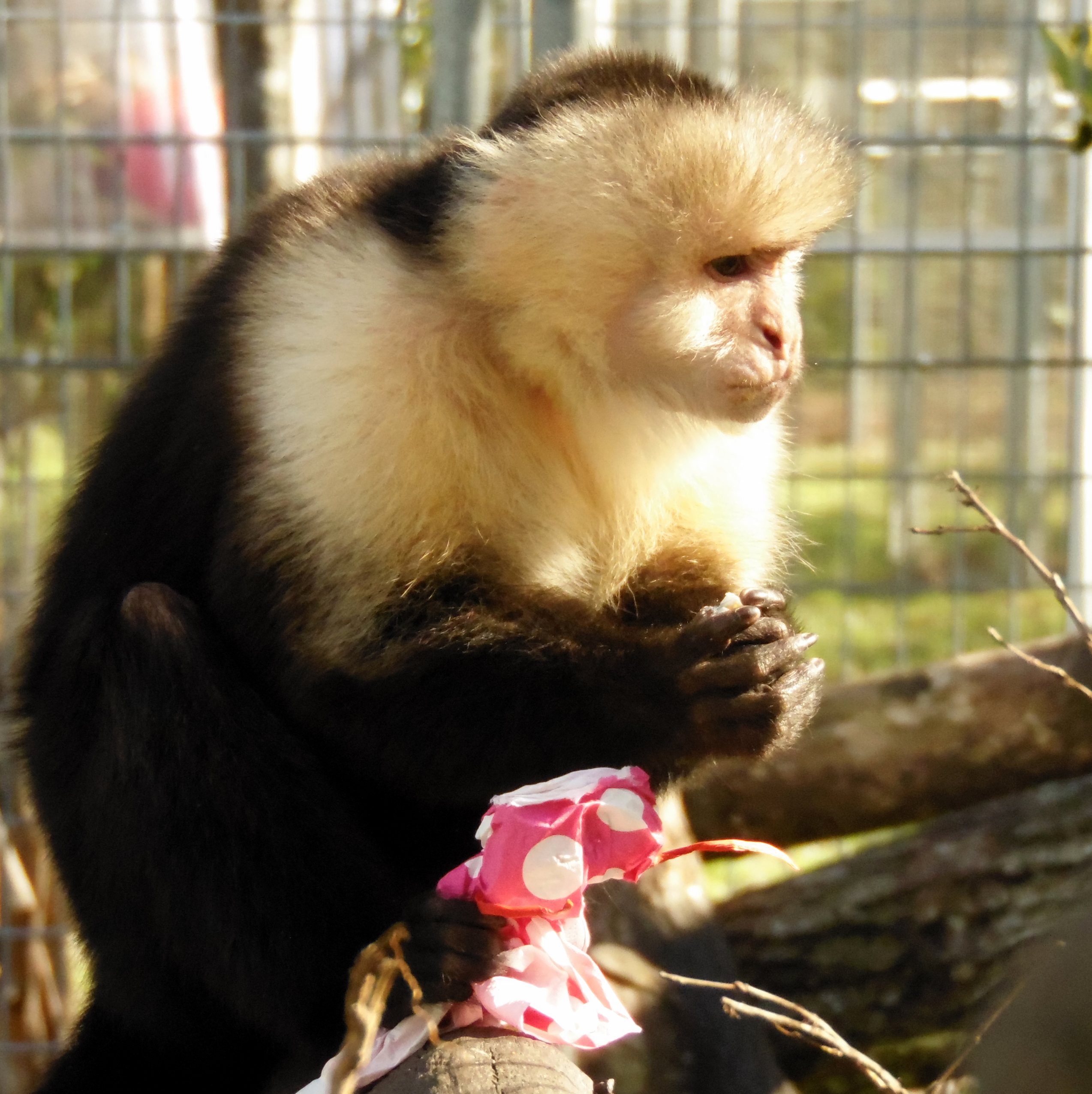 Stinky was taken from her natural mother and sold into the exotic pet trade. Later, she was placed in a zoological organization where she lived for six years, alongside a brown capuchin named Puchi. When the organization closed due to financial issues, Stinky and Puchi needed a permanent sanctuary. They both arrived at Jungle Friends together, but soon Stinky gravitated towards more active monkey companions of her own species and age. Meanwhile, Puchi found solace among an elderly group of brown capuchins, better suited to his relaxed demeanor. Stinky, known for her high energy and playful nature, is one of the liveliest residents at the sanctuary. She enjoys climbing to the top of her habitat, often seen peering over the edge from hanging buckets or diligently exploring the grass and bushes in search of treats.
