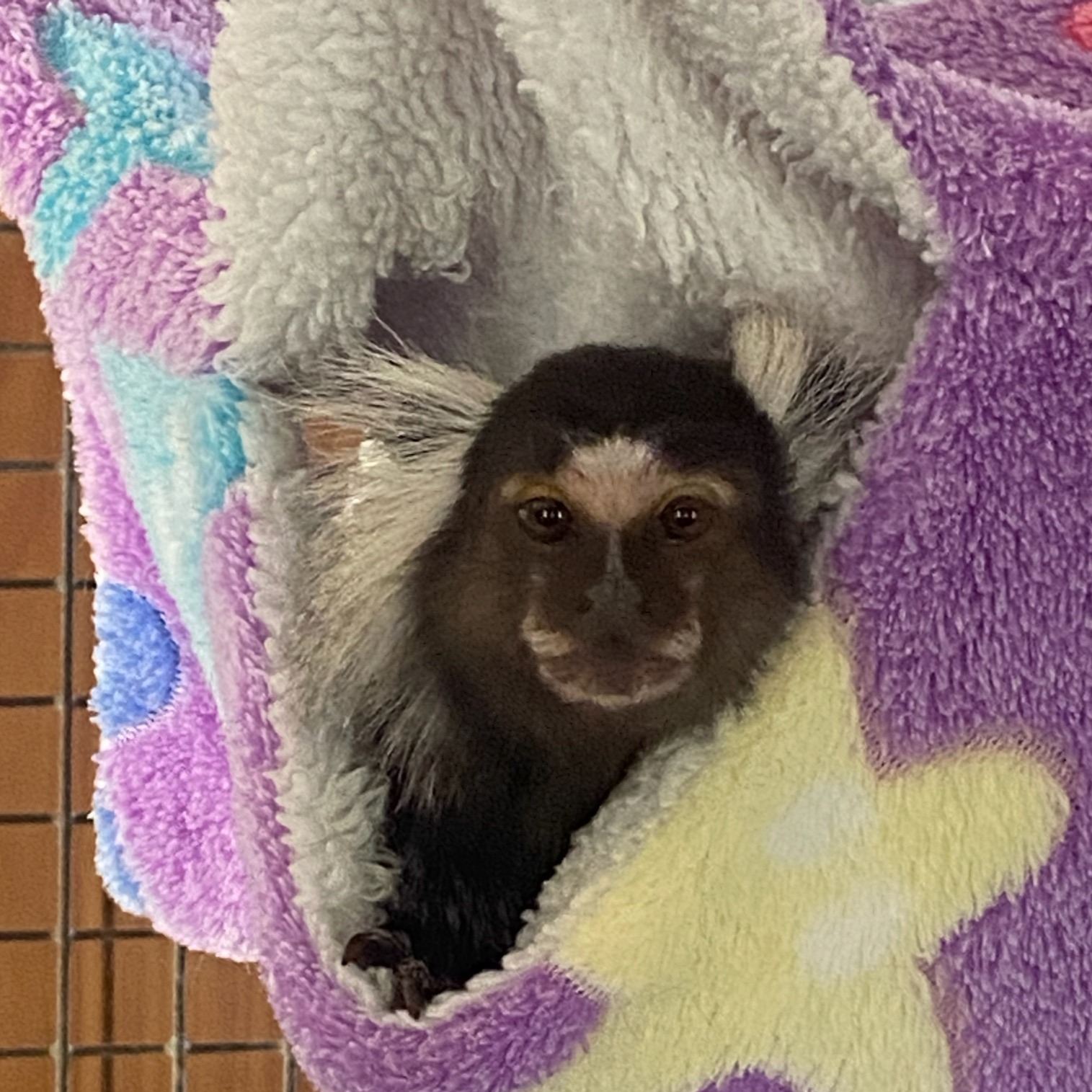 Once part of vocal cord research at a lab where sunshine was a distant dream, Esmeralda now spends her days soaking up golden rays, climbing trees, and keeping a sharp eye on the little forest critters around her from the very top of her habitat. Her favorite way to relax at the end of a busy day? Curling up in her cozy, fuzzy bed for some well-earned rest.