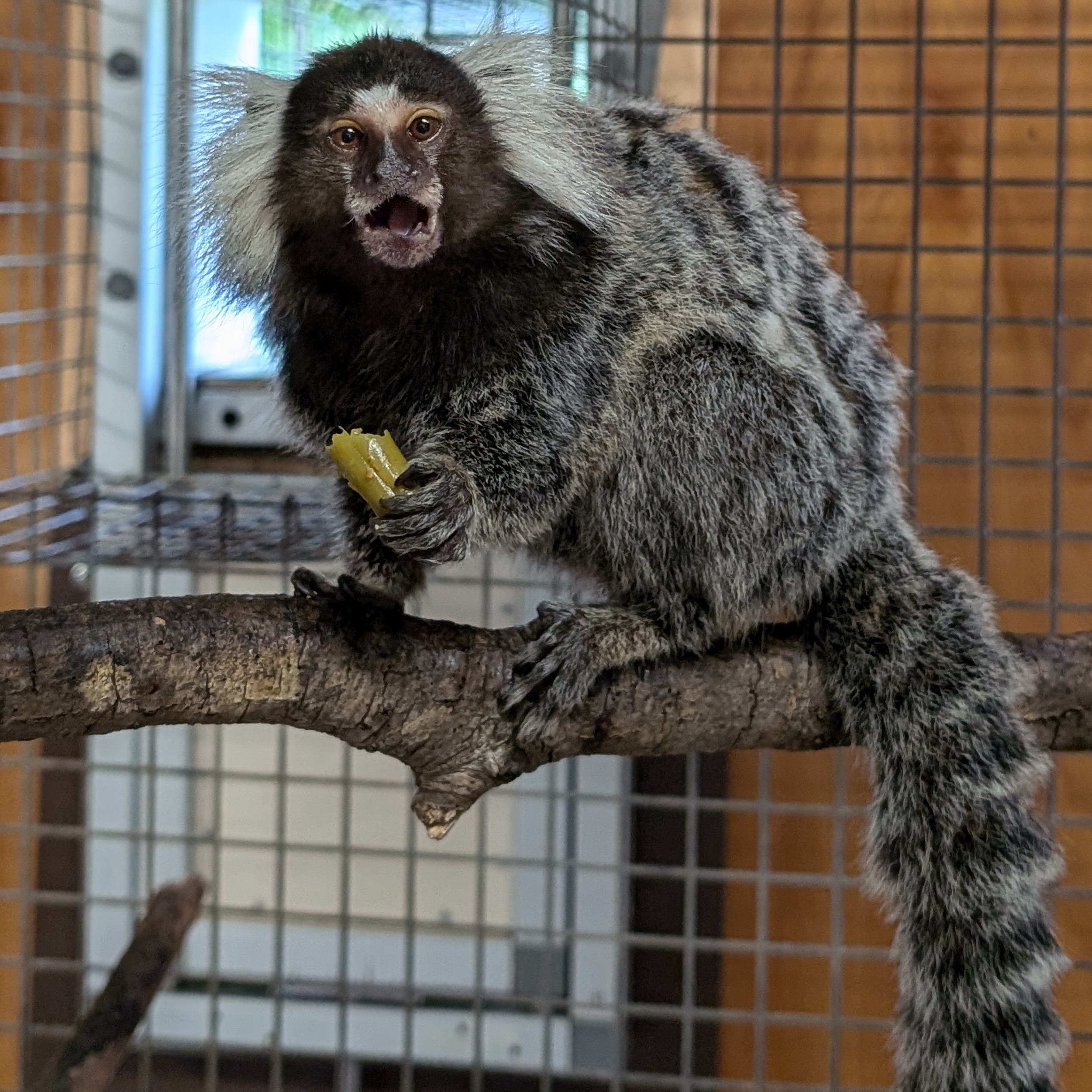 Esmeralda is a feisty older marmoset with a cautious streak, especially when it comes to people. Since arriving at Jungle Friends, she's been living her best life-basking in the sun and ruling over her outdoor domain with ninja-like agility.